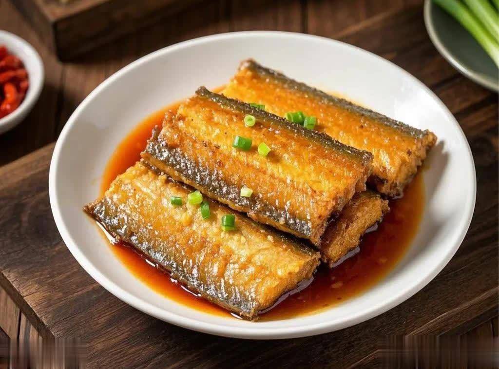 4. 放入带鱼段,轻翻使糖色裹匀,沿锅边烹黄酒、香醋,去腥提鲜。