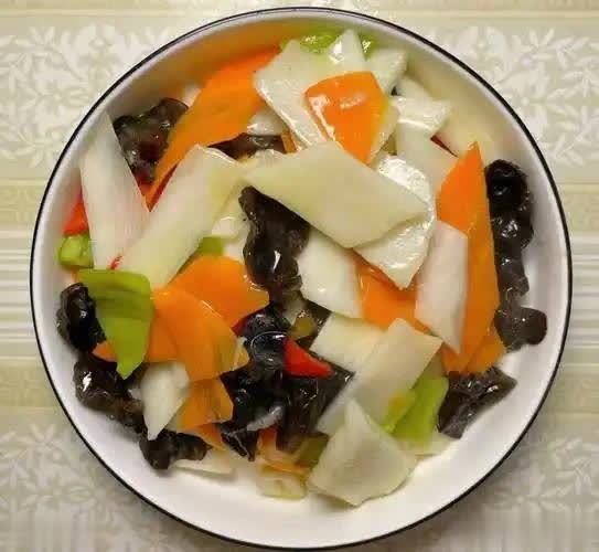 3、起锅烧油,油热放入姜末、蒜末,煸炒出香味,放入山药和木耳,再放入青红椒块,加入1勺盐、1勺鸡精、少许白糖,大火翻炒均匀即可即可出锅。