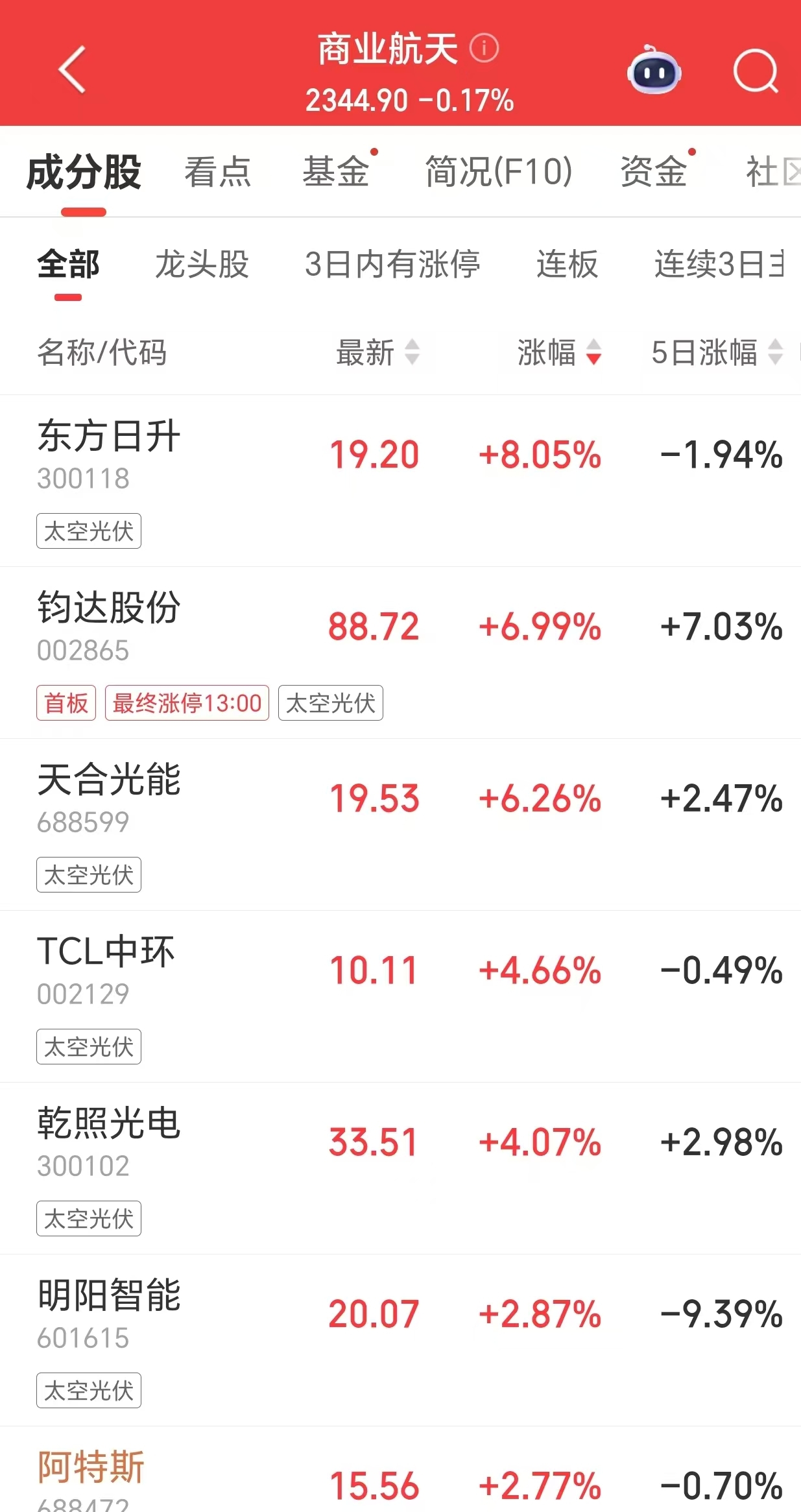 3月20日,太空光伏概念震荡走强。截至界面新闻发稿前,东方日升涨超8%,钧达股份涨近7%,天合光能涨超6%、TCL中环、乾照光电等跟涨。