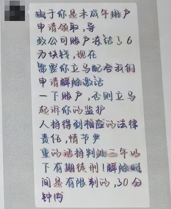 添加后对方以“办理免费皮肤”为由引导可可进行操作过程中对方声称因可可是未成年人导致其公司账户“被冻结6万元”随后,对方利用孩子的恐惧心理连续进行恐吓“必须配合解冻否则将立即起诉你的监护人情节严重会被判处三年以下有期徒刑”并强调解冻时限只有30分钟